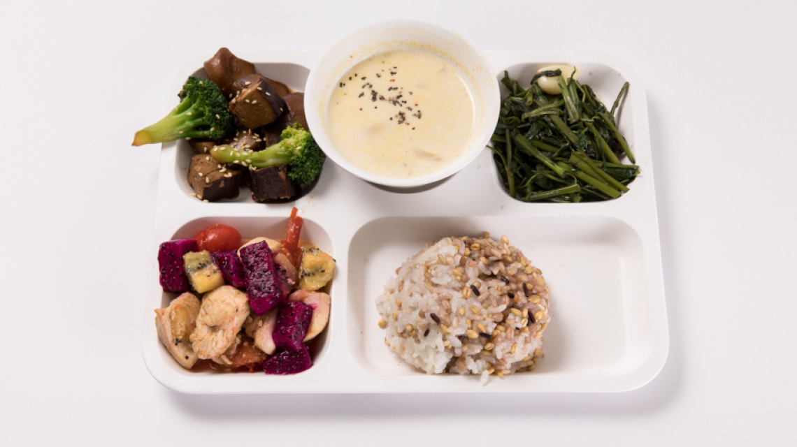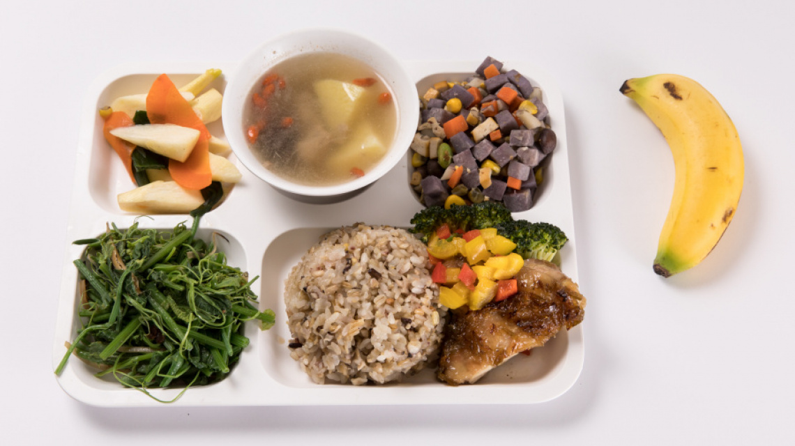 雜糧野菇飯、柚香雞腿排、芋香八寶、香炒美人腿、豆豉龍鬚菜、枸杞紅棗山藥排骨湯、香蕉