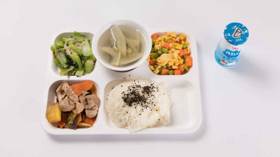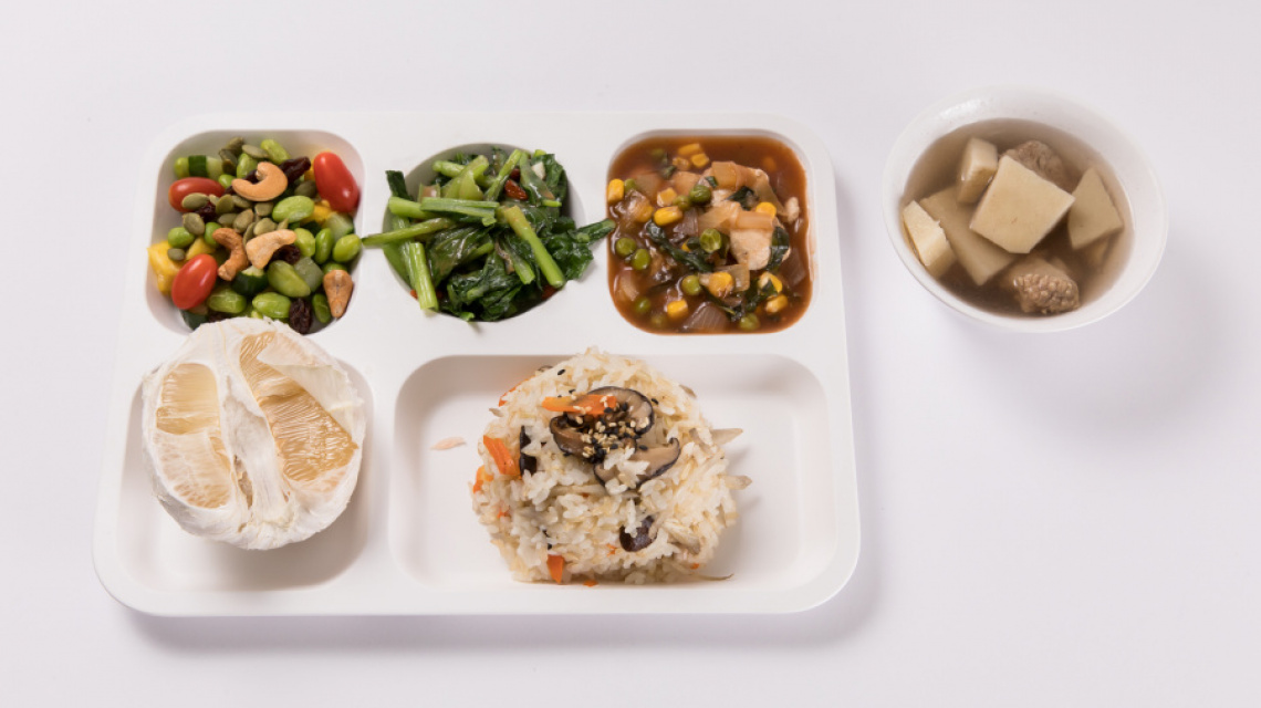 紅藜小米飯、杏菇花雕雞、玉米烘蛋、什錦雜菜、彩蔬花椰菜、冬瓜薏仁肉片湯、芭樂