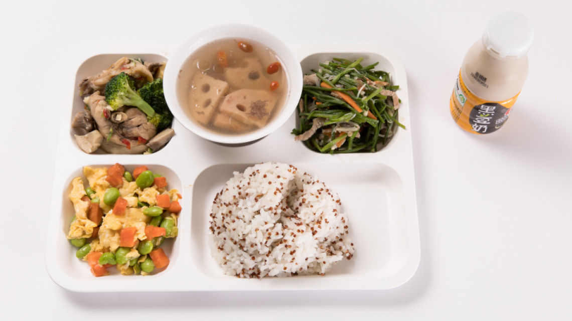 紅藜飯、鹹水雞、毛豆炒蛋、水蓮炒肉絲、蓮藕枸杞湯、黑豆奶