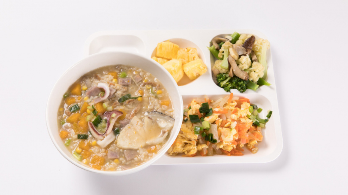 龍膽石斑海產粥、雙色花菜、洋蔥炒蛋、鳳梨