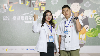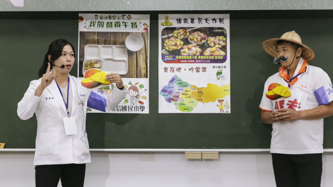 用番茄、玉米、毛豆、洋蔥等地產地銷的農產品,以色彩來增添菜色豐富度,同時透過有獎徵答、廣播等食育活動,提高有機小松油菜的接受度。