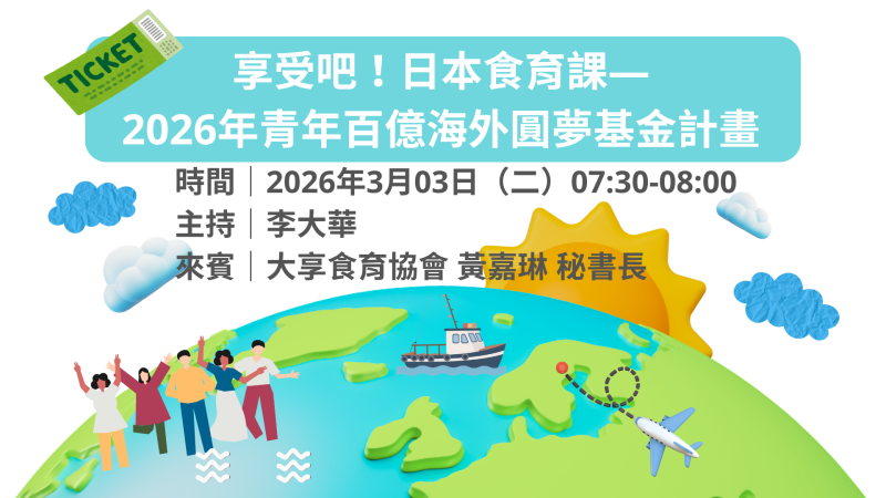 主題|享受吧!日本食育課—2026年青年百億海外圓夢基金計畫 時間|2026年03月03日(二)07:30-08:00 主持|李大華 來賓|大享食育協會 黃嘉琳秘書長 簡介|