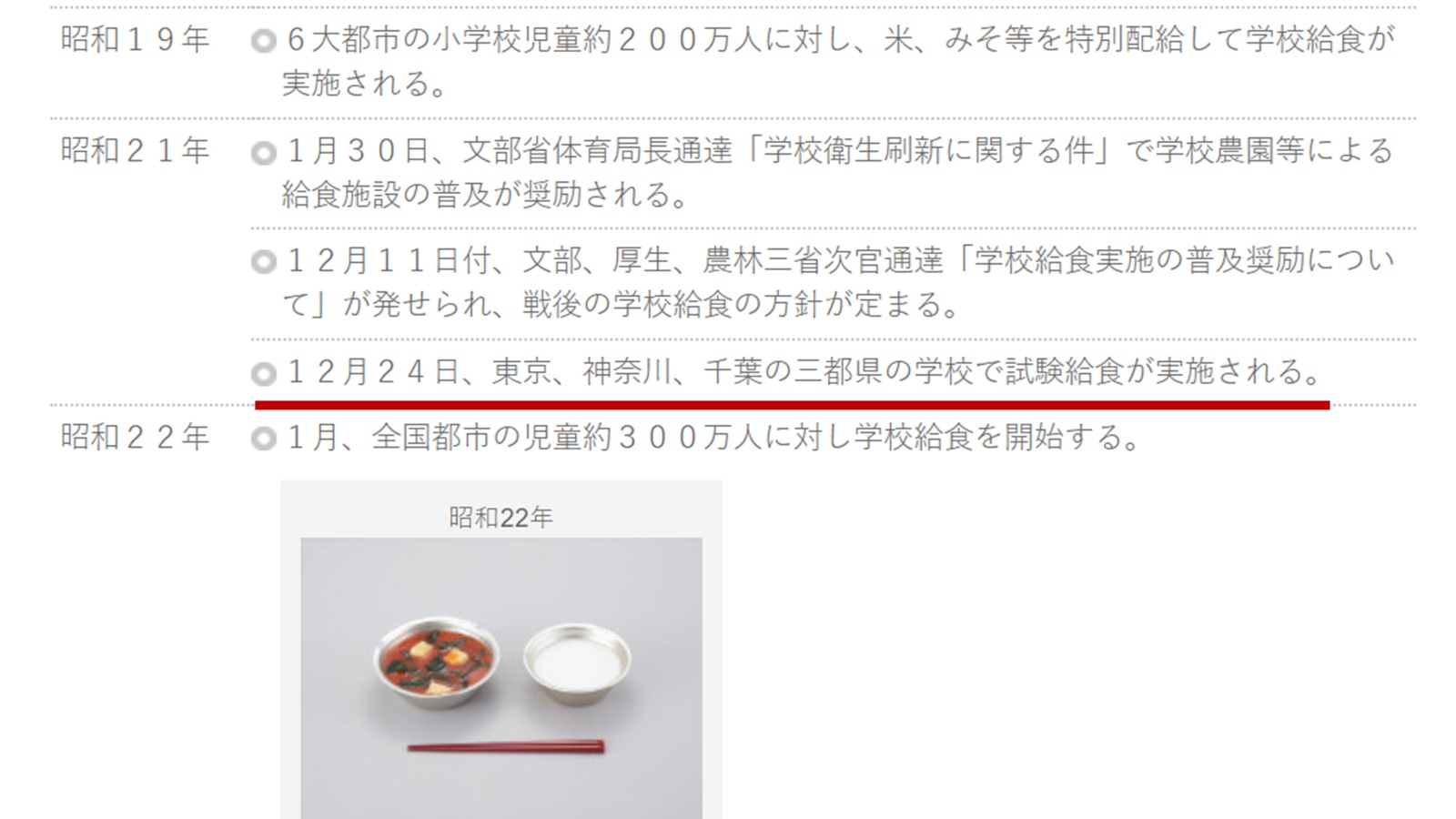因此,12月24日這一天就訂為「學校午餐紀念日」(学校給食記念日)。不過,由於12月24日都是學校休假日,故文部科學省則於1950年(昭和25年),將1月24日至30日訂為「全國學校午餐週」(全国学校給食週間),故學校午餐紀念日順應改為1月24日。