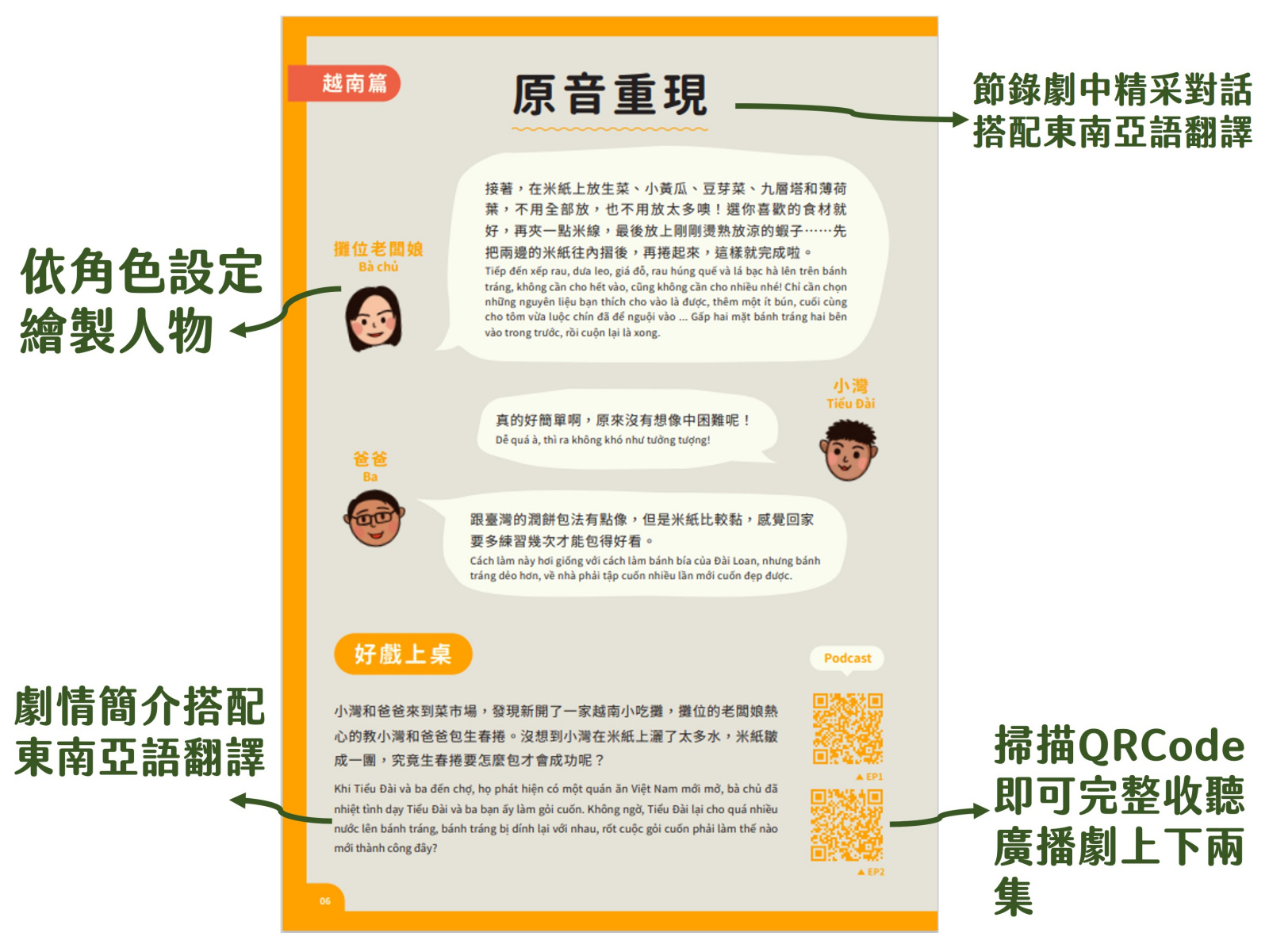 原音重現:摘錄精彩對話,開啟您對於廣播劇中人物的想像。 好戲上桌:劇情簡介與掃描QRCode收聽,廣播劇正式登場。 亞亞學語:廣播劇中經常出現的東南亞語單字,不知不覺就會說! 滋味秘密:在劇中透過對話提及的小知識,圖文解說更容易理解。 滋味食譜:4人份的東南亞料理,和孩子們一起動手試試看。
