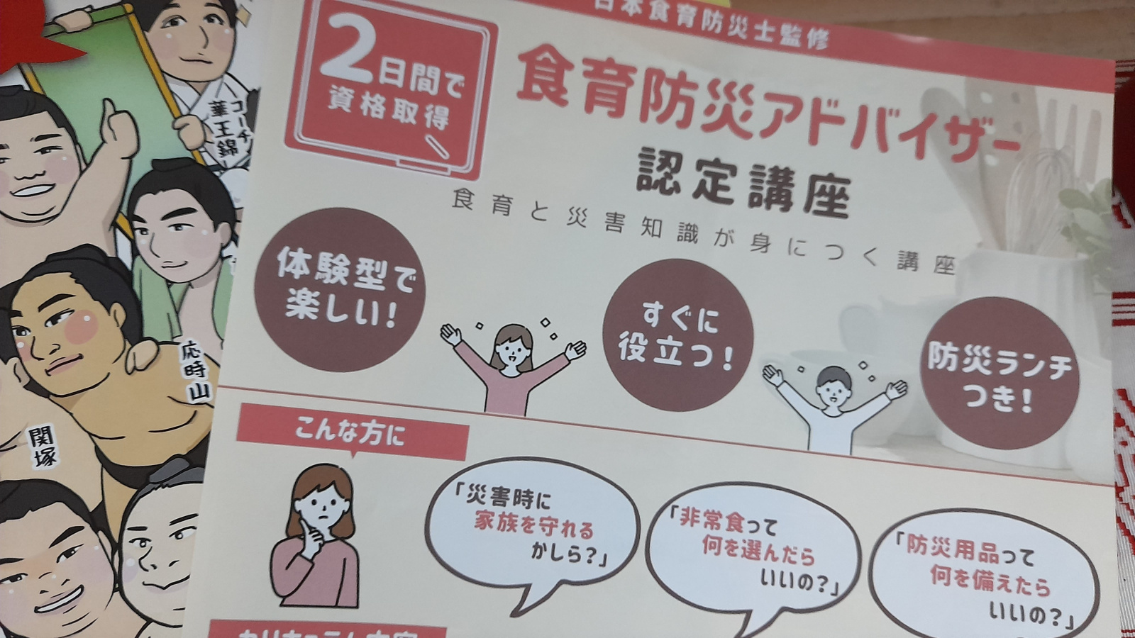 防災食育人員養成有兩種類型的訓練課程,第一種是為期二天的食育防災アドバイザー初階課程,認證講座課程來看,內容包括食育防災顧問課前說明、食育介紹、食品衛生與料理體驗、認識災害、學習防災儲備糧食工作、模擬假想災害來臨時的實際應變和筆試等項目,目前共有一百多人取得資格,對象有學生、家庭主婦、教師和救護相關人員等,相當多元。