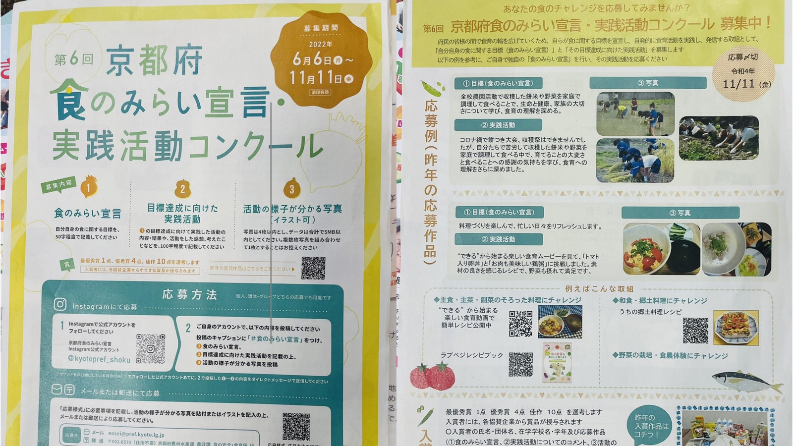 例如,有人許下「我每天都吃早餐!」並且記錄下來的承諾;同學們約好「我們班會把學校午餐吃光光!」的減少剩食行動;亦有「我的菜單裡使用京都府的食材」、「我們把飲食文化傳承給孩子們!」、「我來教導民眾務農之樂。」等目標。