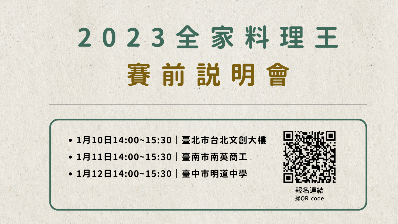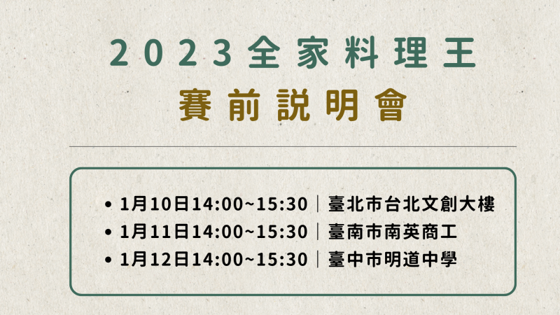 設計出適合上架便利商店的鮮食商品,為了讓參賽選手及指導老師更快速掌握比賽的精神,主辦單位將於2023年1月10日至12日間,於臺北、臺中、臺南三地各辦理一場說明會。