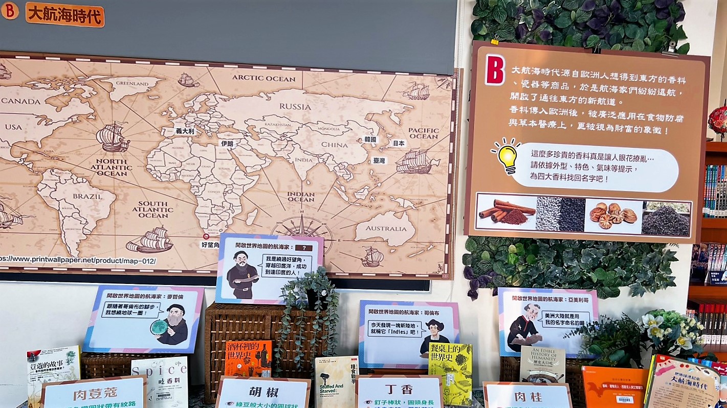 今回の海外給食献立交流プロジェクトに合わせ、学校は特別に「テーブルの上の世界史」と題するブックフェアも開催しました。このイベントでは雲林県の食材のアピールに加え、大航海時代に世界の国々がどのように食材を保存し、異国の香料を活用して多彩な食文化を創造したかが紹介されました。