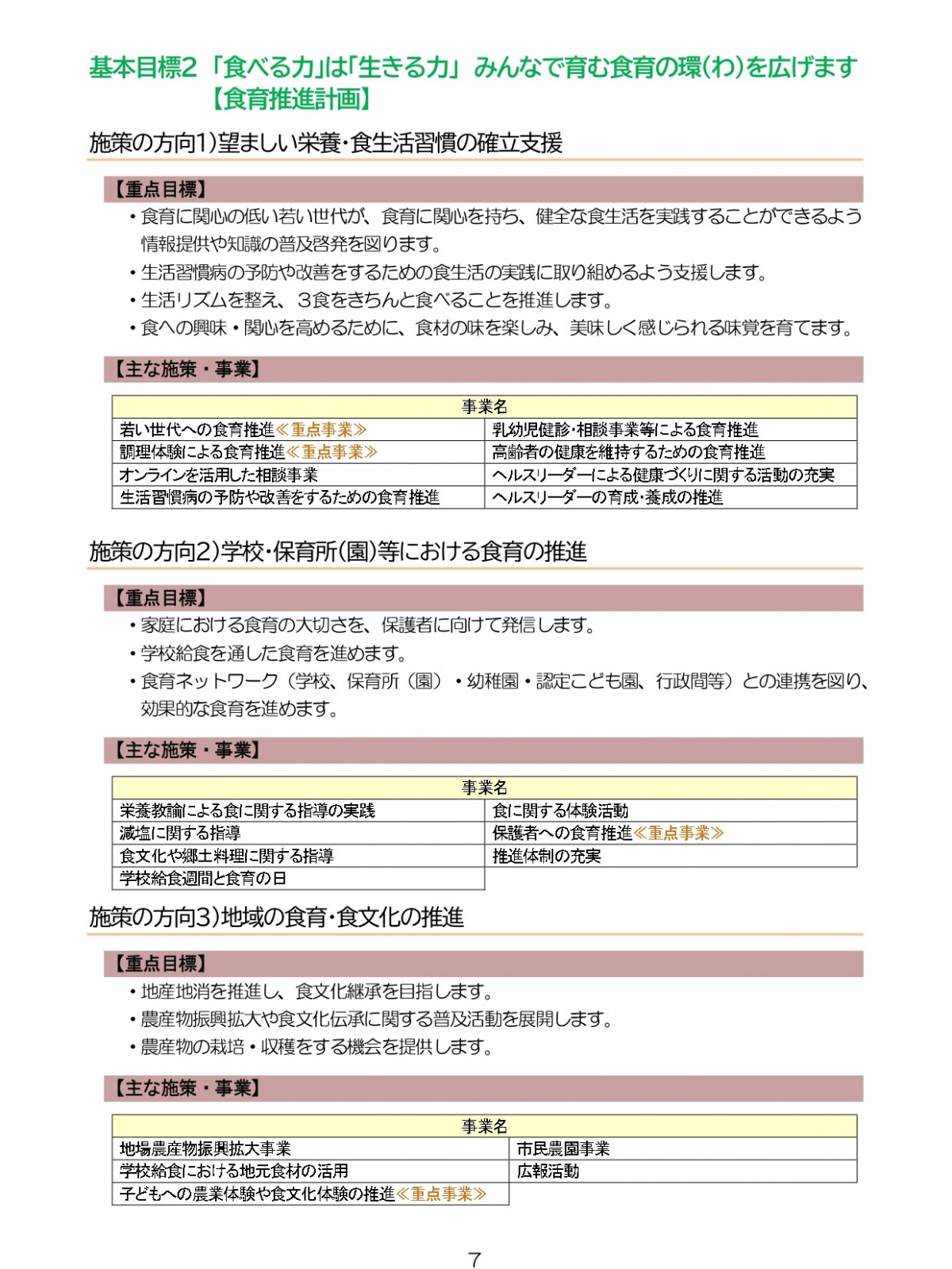對於國中小學校的食育指導,亦配合子計畫中的食育推進計畫,針對不同年級設定主題與目標。例如國小一年級主題為「我們和蔬菜好好相處吧」 (好可愛),設定目標為「認識蔬菜好處和鼓勵多吃蔬菜」;至於國中三年級,則是針對升學課題,以「促進學習的飲食」為主軸,改善自身飲食習慣,養成健康身體來面對考試挑戰。