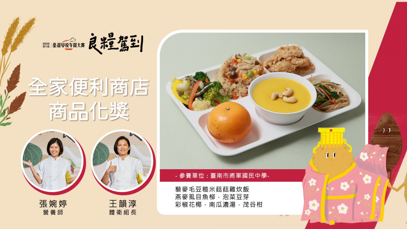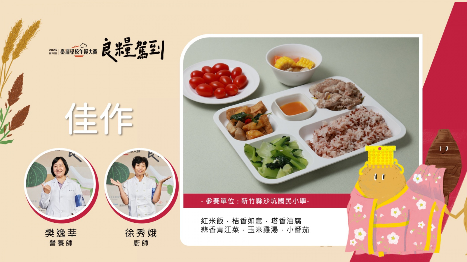 【選手】樊逸莘(營養師).徐秀娥(廚師) 【作品】紅米飯.桔香如意.塔香油腐.蒜香青江菜.玉米雞湯.小番茄 【對象】國小4至6年級 【永續發展目標】SDG2–消除飢餓.SDG4–優質教育