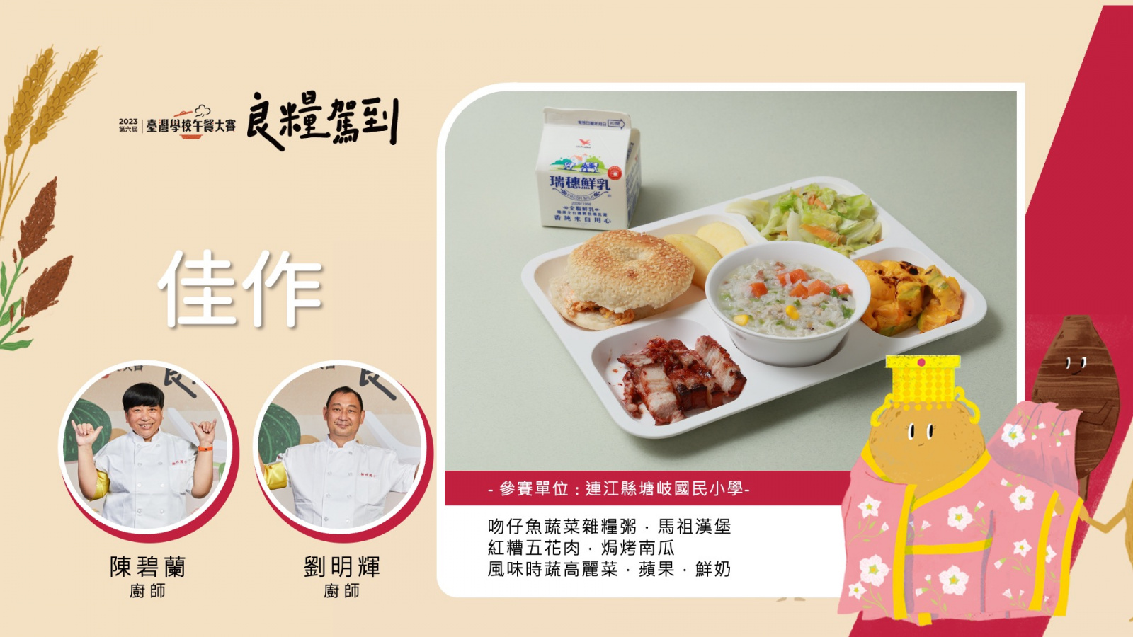 【選手】陳碧蘭(廚師).劉明輝(廚師) 【作品】吻仔魚蔬菜雜糧粥.馬祖漢堡.紅糟五花肉.焗烤南瓜.風味時蔬高麗菜.蘋果.鮮奶 【對象】國小4至6年級 【永續發展目標】SDG2–消除飢餓.SDG12–負責任的消費與生產.SDG13–氣候行動