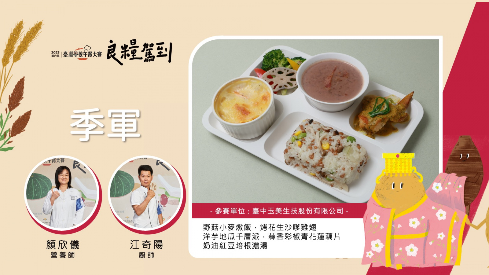 【選手】顏欣儀(營養師).江奇陽(廚師) 【作品】野菇小麥燉飯、烤花生沙嗲雞翅、洋芋地瓜千層派、蒜香彩椒青花蓮藕片、奶油紅豆培根濃湯 【對象】國小4至6年級 【永續發展目標】SDG2—零飢餓、SDG4—優質教育、SDG12—負責任消費及生產