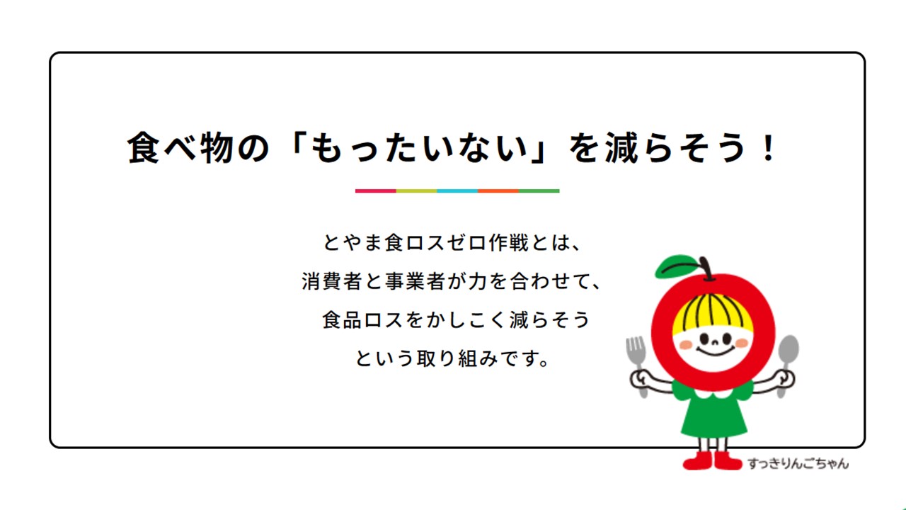 為了減少食品浪費和食品廢棄物,富山縣於平成29年(2017)5月創建「富山縣食品損失.食品廢棄物削減推進縣民會議」,展開名為「富山食品零損失作戰(とやま食ロスゼロ作戦)」計畫,以「全使用.全食用.愉悅心情.環保生活」為口號,推出「心情愉悅的蘋果小姐」吉祥物,邀請富山縣內消費者、事業者、相關團體、政府以其各自立場提出並落實「削減食物損失」對策,共同致力實現永續發展的社會。