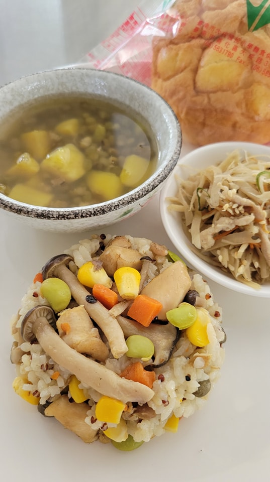 ※今日餐點:藜麥毛豆糙米菇菇雞炊飯、清炒牛蒡絲、綠豆地瓜湯(冰) 、菠蘿麵包