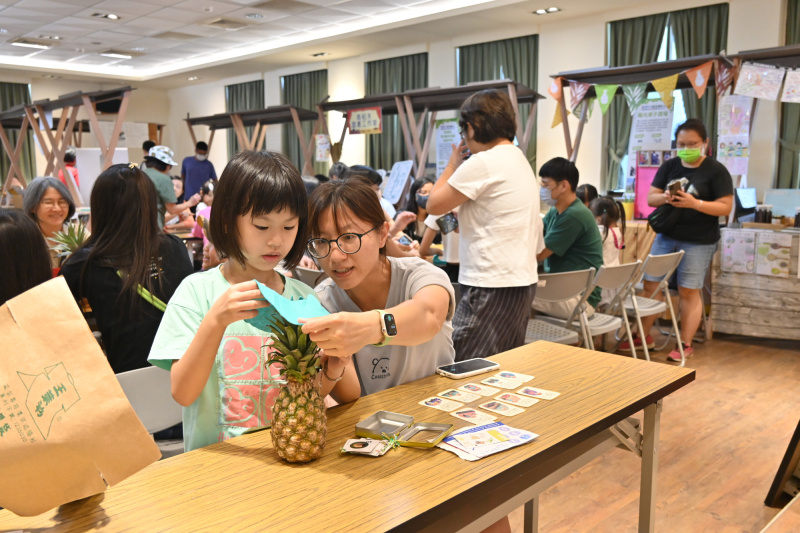 由陽光果子農場執行鄭蕙玲帶領大家進行鳳梨的食農體驗課,從一開始認識鳳梨的構造及熟成條件,民眾紛紛驚訝表示鳳梨長成竟需要18個月,更首次認識鳳梨開花的知識,並經由蕙玲講解產地到餐桌的過程,加深大家食農知識的養成。