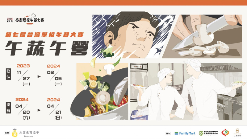 第七屆臺灣學校午餐大賽以「蔬食」為主題來一決勝負,邀請全國學校午餐從業人員一起引領多蔬少肉潮流,開發減少剩食、友善環境的餐點,讓學生在餐桌上學習永續飲食、在地文化、蔬果種類、環境生態等議題。