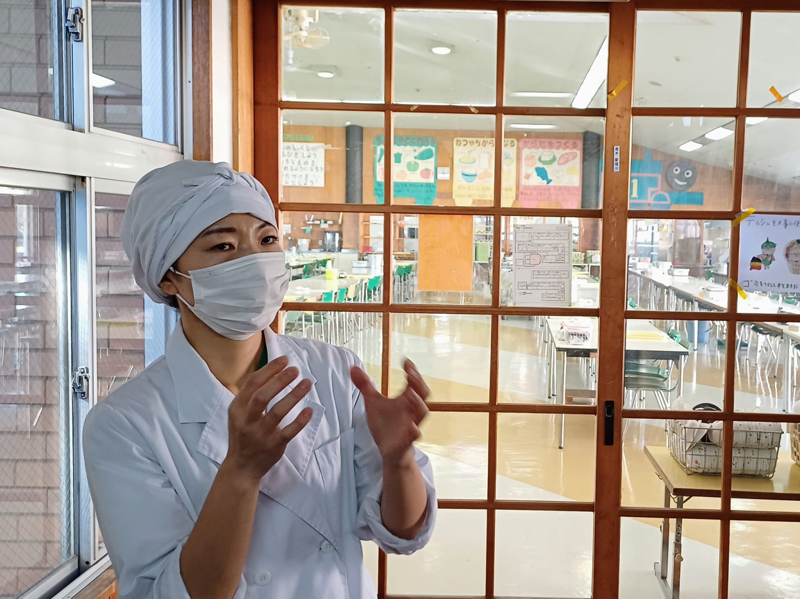 帶著我們來到食堂的飯田營養教師,有著14年的營養師資歷,4年前來到這所學校服務,和7名調理員共同負責每日300份的餐點。她指著在正在廚房協助清潔的一名調理員說,她是這所學校的畢業生喔,今天各位享用的蜂蜜布丁,就是她一人手做包辦。