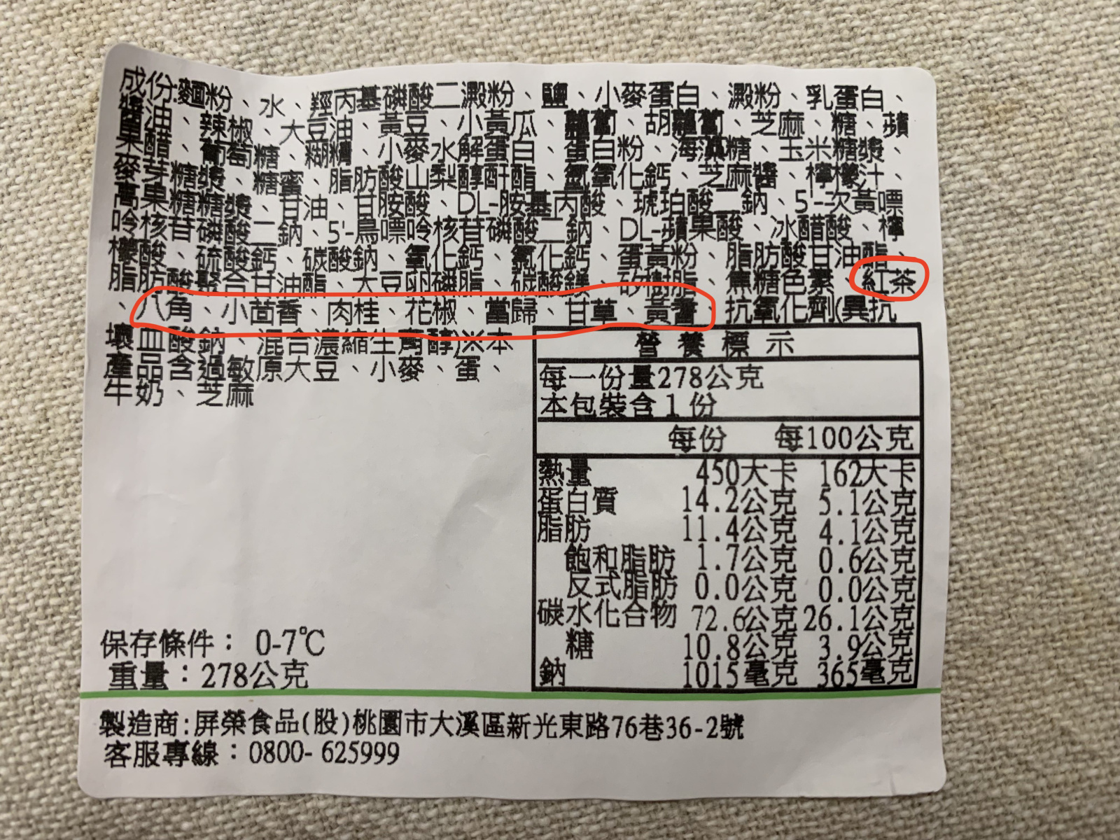 產品中所使用的原料還有當歸、黃耆、甘草、小茴香等天然香料,令人訝異的是大部分的原料為臺灣生產(資料來源:全家食在購安心),此為全家料理王競賽中,使用在地食材的重要精神。