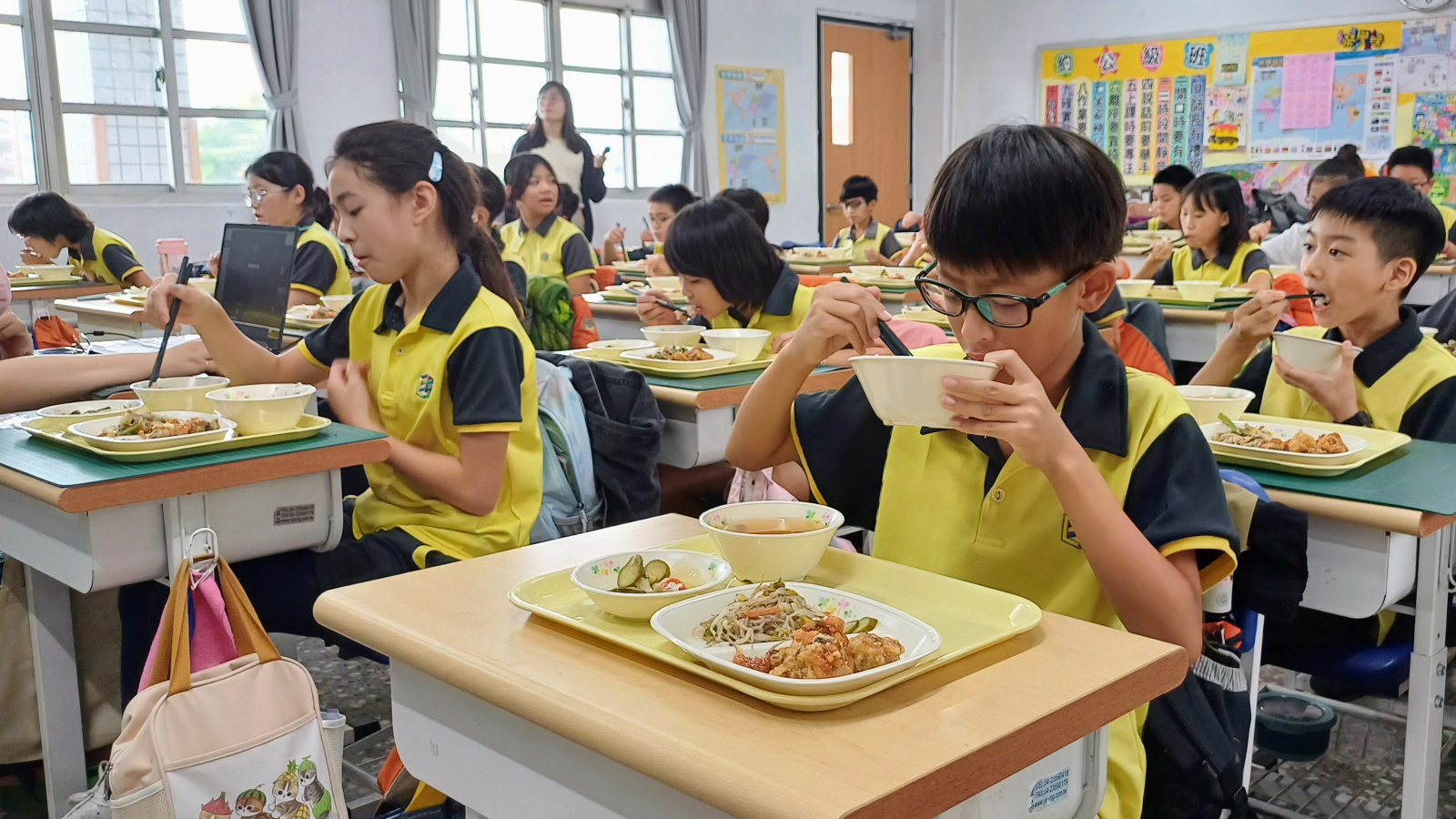 台中市忠信國小五年二班的同學們,看著面前那份日本學校午餐餐點,顯得蠢蠢欲動,恨不得馬上大快朵頤。