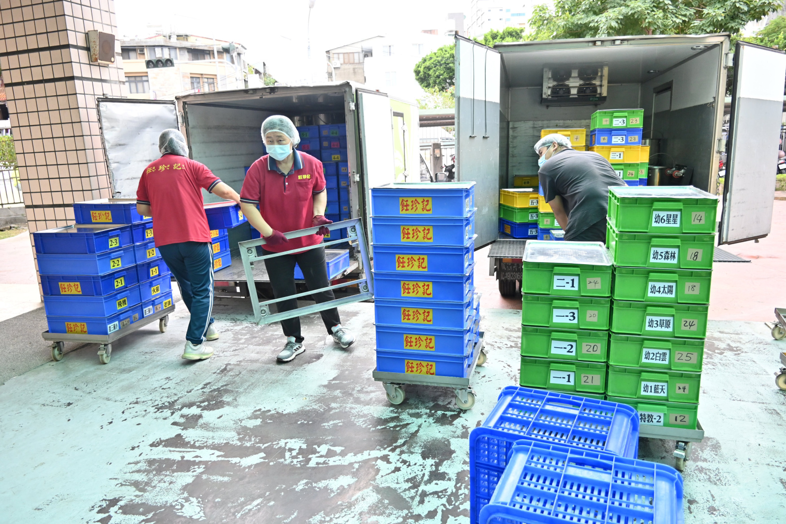 廚房外,我們見到餐桶被有條不紊地搬上車的景象。對於每日供應超過 2000 份午餐的五權國中來說,已是習以為常。但對毛奇來說,當年學校可沒有自設廚房,這是學生時期未曾在校園見過的場面。