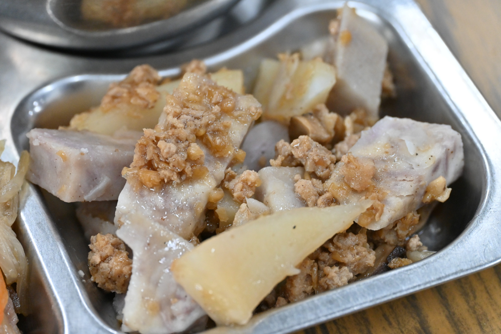 午餐時間到了,大家一起享用毛奇設計的料理。這道「香菇肉燥芋頭」結合臺中的大甲芋頭與新社香菇製作而成,香菇肉燥的香氣巧妙掩蓋了芋頭中小朋友不喜歡的味道,再結合同為根莖類的馬鈴薯,使整體風味更加柔和,十分下飯。此外,毛奇也考慮到餐點從製備完成到實際品嘗的時間,這道菜的烹調方式即使未立即享用,仍能保持其美味。