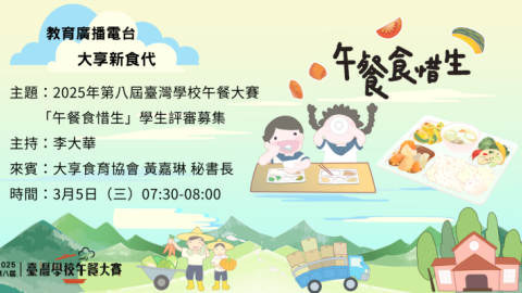 主題|第八屆臺灣學校午餐大賽「午餐食惜生」正式開伙 時間|2025年4月2日(三)07:30-08:00 主持|李大華 來賓|大享食育協會 黃嘉琳秘書長 簡介|