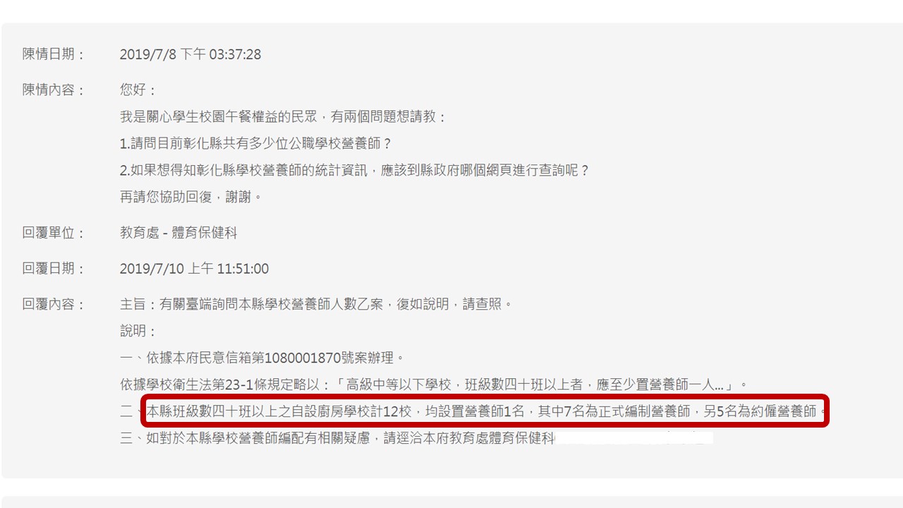 2019年7月8日(一)下午,分別至22縣市府官網填寫市政或縣市長信箱,詢問「公職學校營養師人數」及「可供查詢的管道」,以下為回信受理的頁面之一。