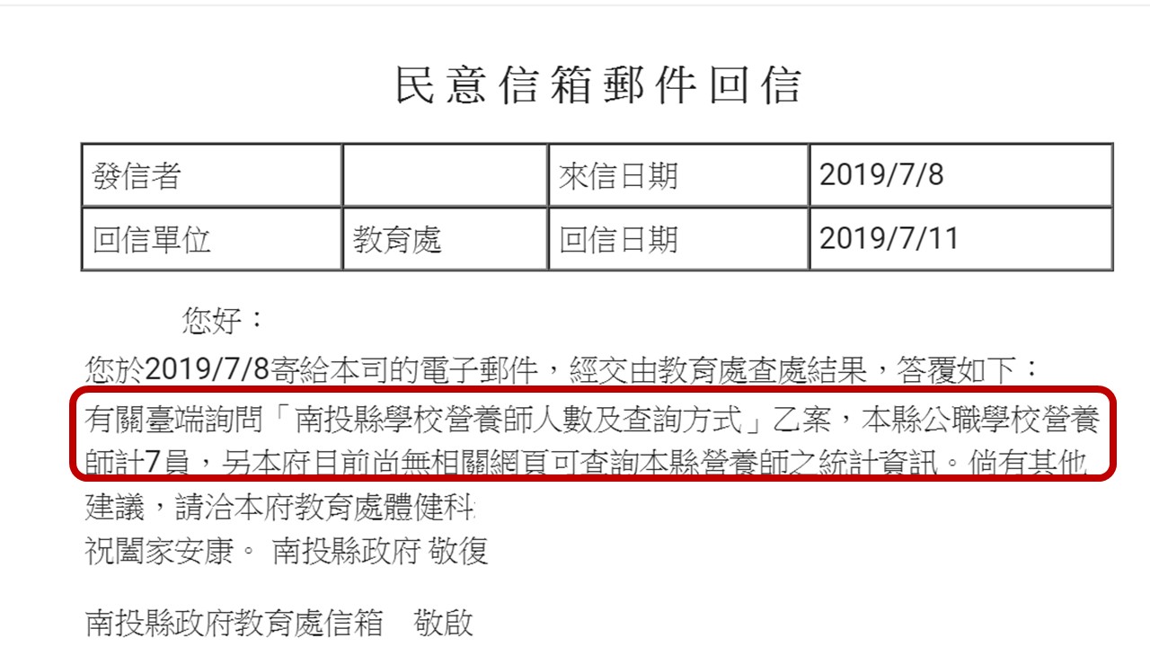 前情提要:今年六月,我們為了想要知道全國學校營養師總人數,透過教育部網站寫信詢問,後得到國教署來函告知:「因營養師由各地方政府及學校聘用,本署無建置網頁供查詢,107年經彙整各地方政府資料計約433人。」