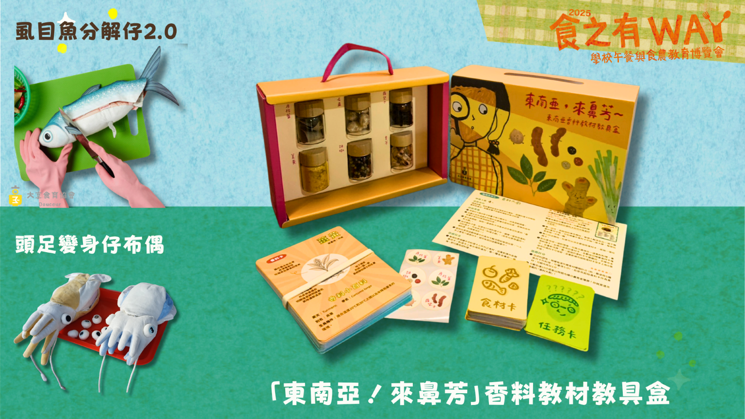 大享食育協會攤位將提供四場次體驗活動,包含「頭足變身仔布偶」、「虱目魚分解仔2.0」粉絲見面會,以及本會最新出版教具「東南亞!來鼻芳」香料教材教具盒等限定體驗活動,歡迎現場到攤位報名!