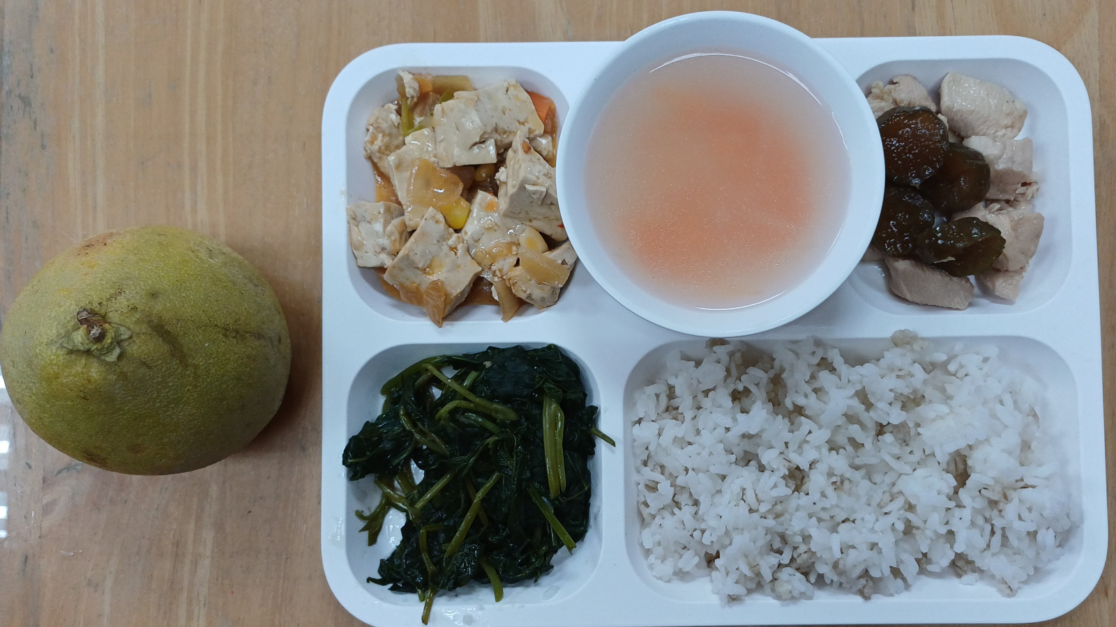 圖說:當天的午餐菜色為麥片飯、瓜子雞、紅燒豆腐、蔥酥地瓜葉、雙色蘿蔔湯、文旦