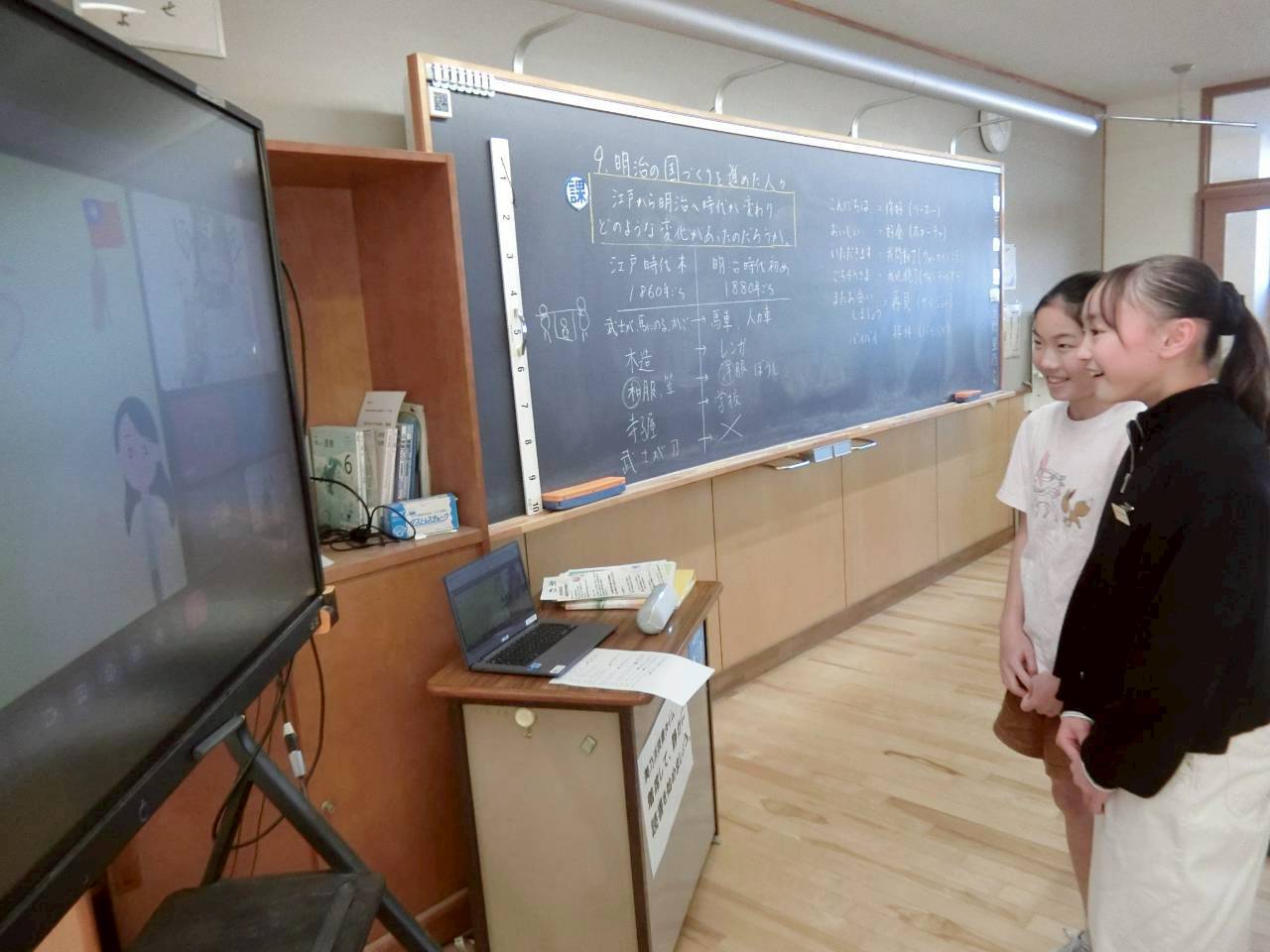 食育指導告一段落後,日本學生在保立老師的引導下依序來到鏡頭前,提出關於臺灣學校午餐的型態、受歡迎的料理、常吃的魚類、甜點供應等問題。