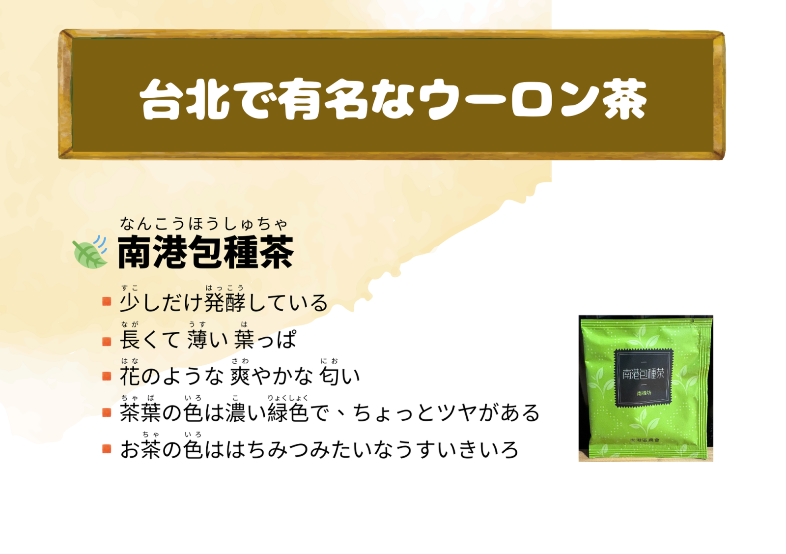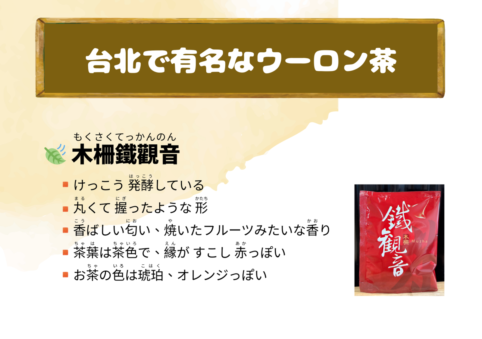 這次一起來到第20回食育推進全國大會的臺北茶,是由農會生產的木柵鐵觀音和文山包種茶,兩種茶的發酵程度不同,鐵觀音的發酵程度較高、包種茶的發酵程度較低,因而兩種茶的茶色和茶香呈現出很明顯的差異;而日本常見的綠茶,屬於不發酵茶,茶味較苦、茶香單純。