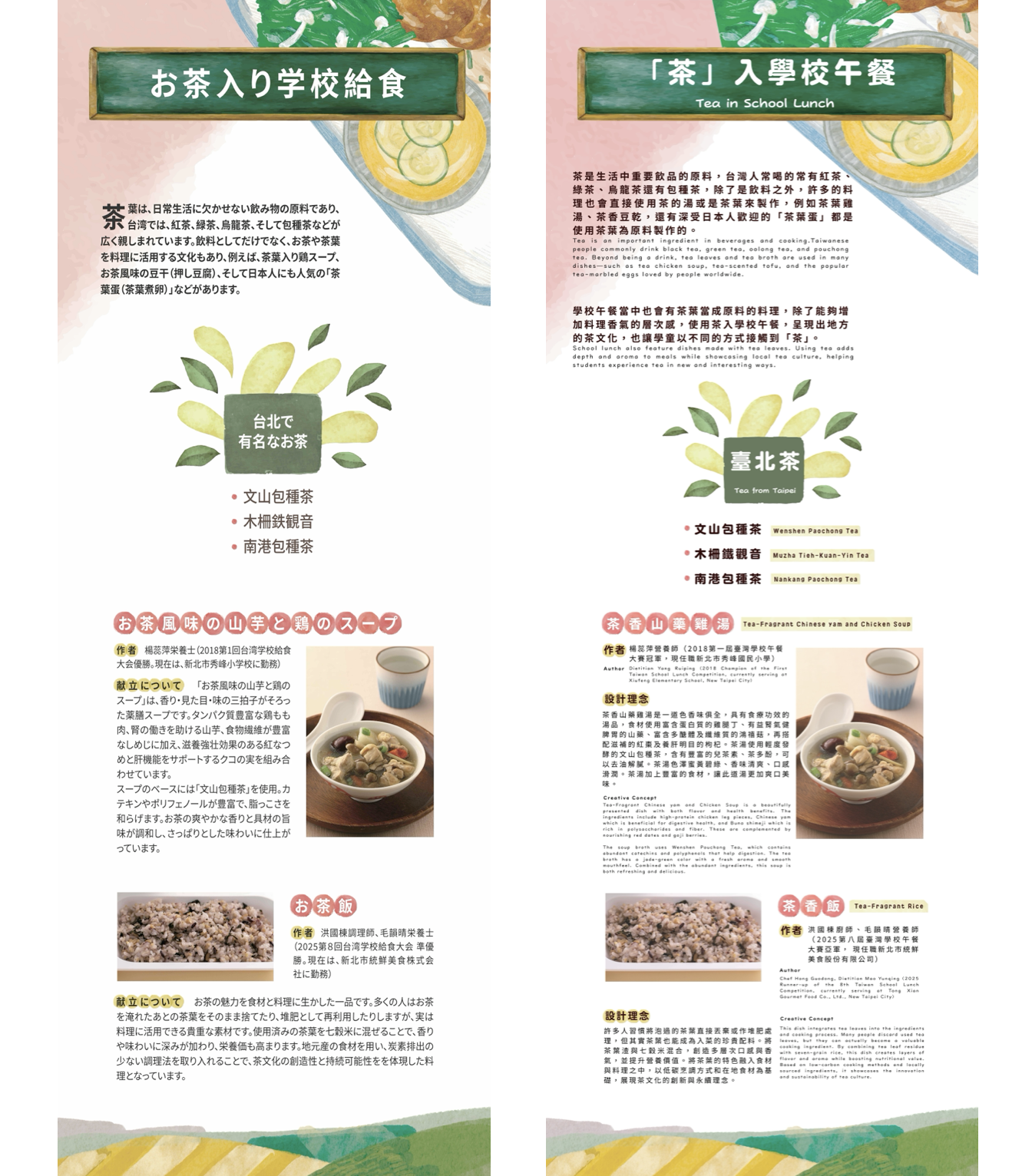 學校午餐當中也會有茶葉當成原料的料理,除了能夠增加料理香氣的層次感,使用茶入學校午餐,呈現出地方的茶文化,也讓學童以不同的方式接觸到「茶」。