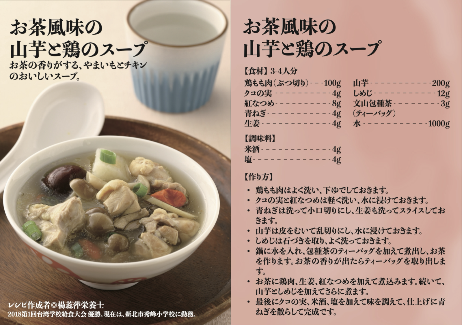 「お茶風味の山芋と鶏のスープ」は、香り・見た目・味の三拍子がそろった薬膳スープです。タンパク質を多く含む鶏もも肉に、腎の働きを助け胃腸の調子を整える山芋、多糖体と食物繊維が豊富なしめじを加え、さらに滋養強壮に効果のある紅なつめと、肝機能をサポートし目にも良いとされるクコの実を組み合わせています。スープのベースには、軽発酵タイプの「文山包種茶」を使用。カテキンやポリフェノールを豊富に含み、脂っこさを和らげる効果があります。お茶は、はちみつのような黄緑色で、爽やかな香り、口当たりはまろやか。お茶の風味と具材の旨味が調和し、さっぱりとした味わいに仕上がっています。