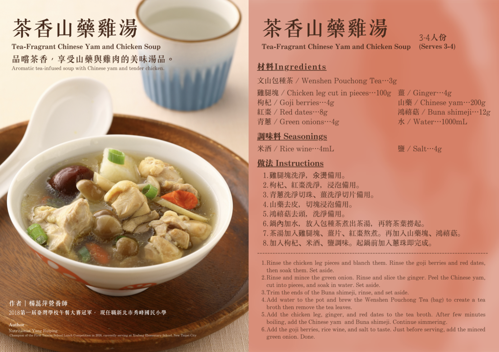 茶香山藥雞湯是一道色香味俱全,具有食療功效的湯品,食材使用富含蛋白質的雞腿丁、有益腎氣健脾胃的山藥、富含多醣體及纖維質的鴻禧菇,再搭配滋補的紅棗及養肝明目的枸杞。茶湯使用輕度發酵的文山包種茶,含有豐富的兒茶素、茶多酚,可以去油解膩。茶湯色澤蜜黃碧綠、香味清爽、口感滑潤。茶湯加上豐富的食材,讓此道湯更加爽口美味。