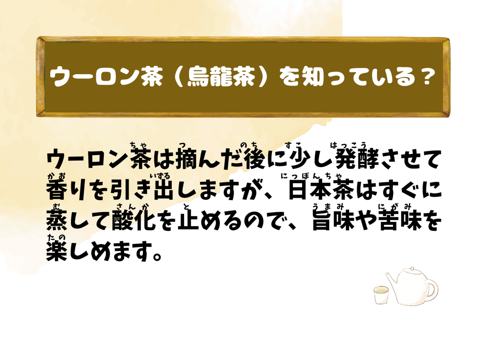 而為了讓來訪的觀眾認識烏龍茶,設計了觀茶色、聞茶香、以及從茶葉形態來分辨不同發酵程度的茶的差異。