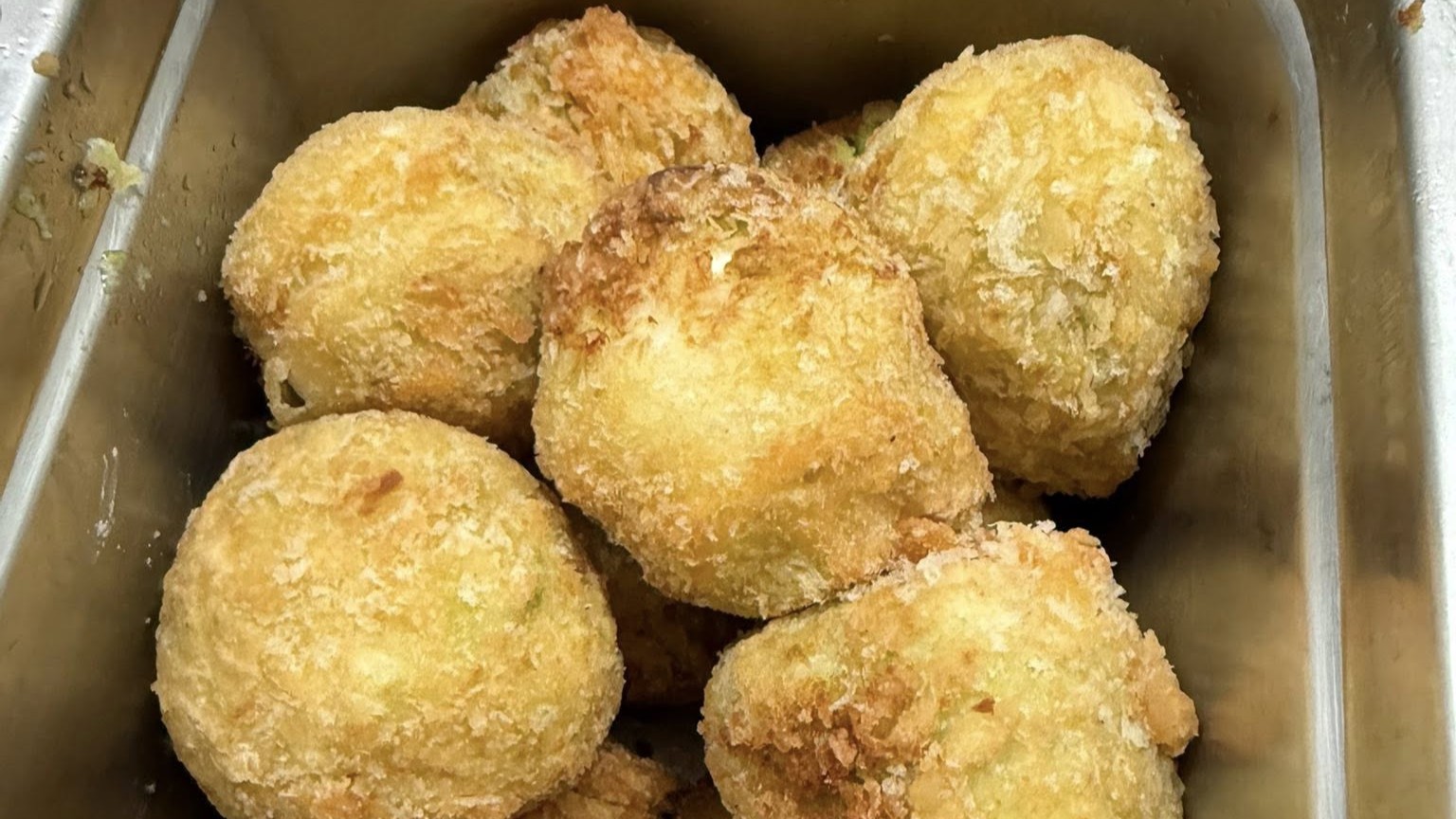 但老實說,這道料理真的不是一般的「搞工」,既要打泥,又特別黏手,然後還要油炸。因此,我們特別把它安排成為12月24日平安夜的百人份素食食譜,搭配蘑菇鐵板麵與義式奶香豆腸,一起化身成孩子們的聖誕特餐!