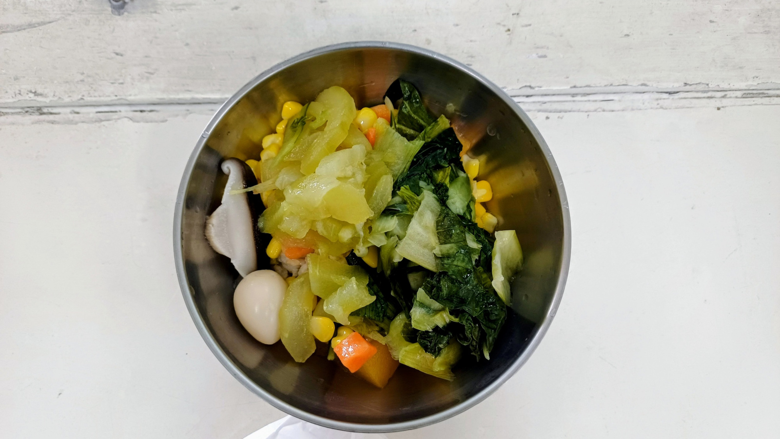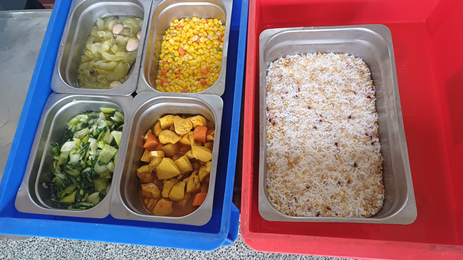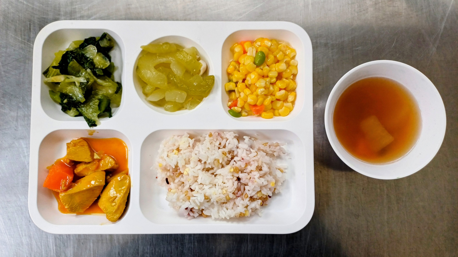 圖說:今日菜色為多穀飯、咖哩雞、黃瓜鴿蛋、三色玉米、青江菜,另有紅燒豬肉湯。