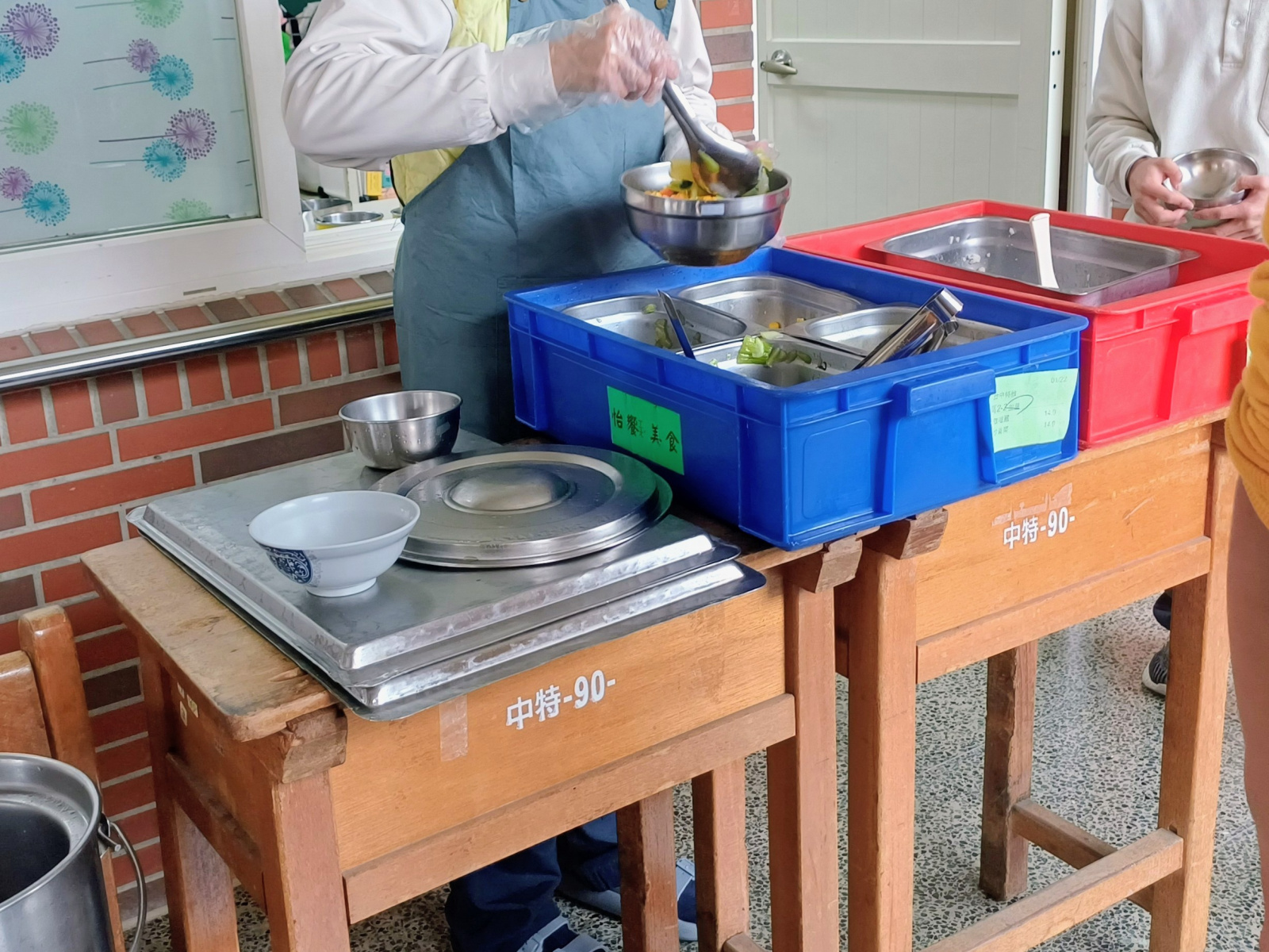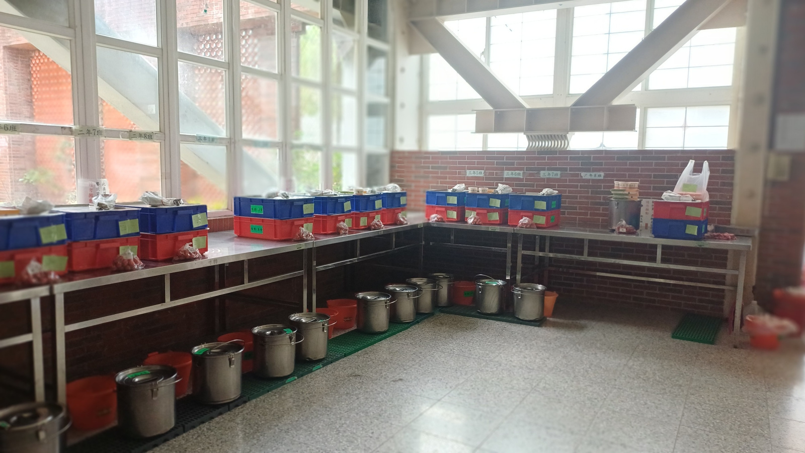 接近中午用餐時間,倍瑩組長帶著我前往高職部班級觀察學生用餐情況,並說明每日餐點約於上午十一點至十一點二十分送達,由各班學生協助抬餐,十二點半左右學生再將餐桶送回指定位置,最後團膳公司回收的時間約莫於下午一點。