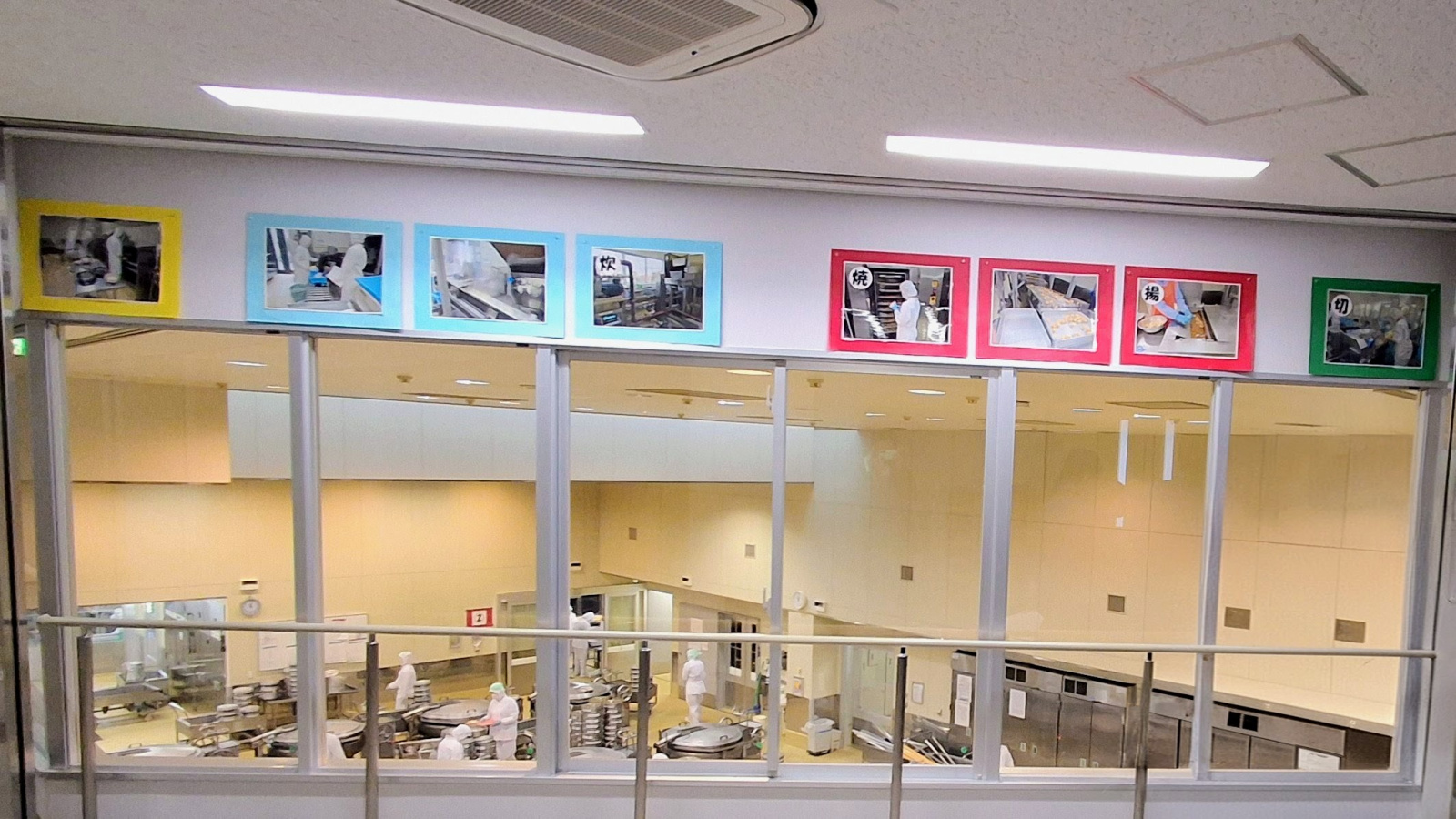 此行最驚喜的發現之一,是在參觀走道的牆壁上發現中心特別以四種顏色標示料理業務區域,綠色是食材處理、紅色是烤炸、藍色是煮飯、黃色則是專為料理過敏餐點的空間。