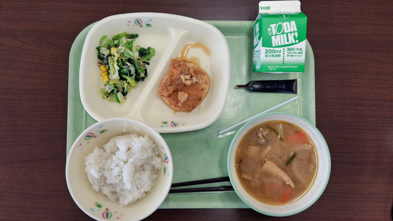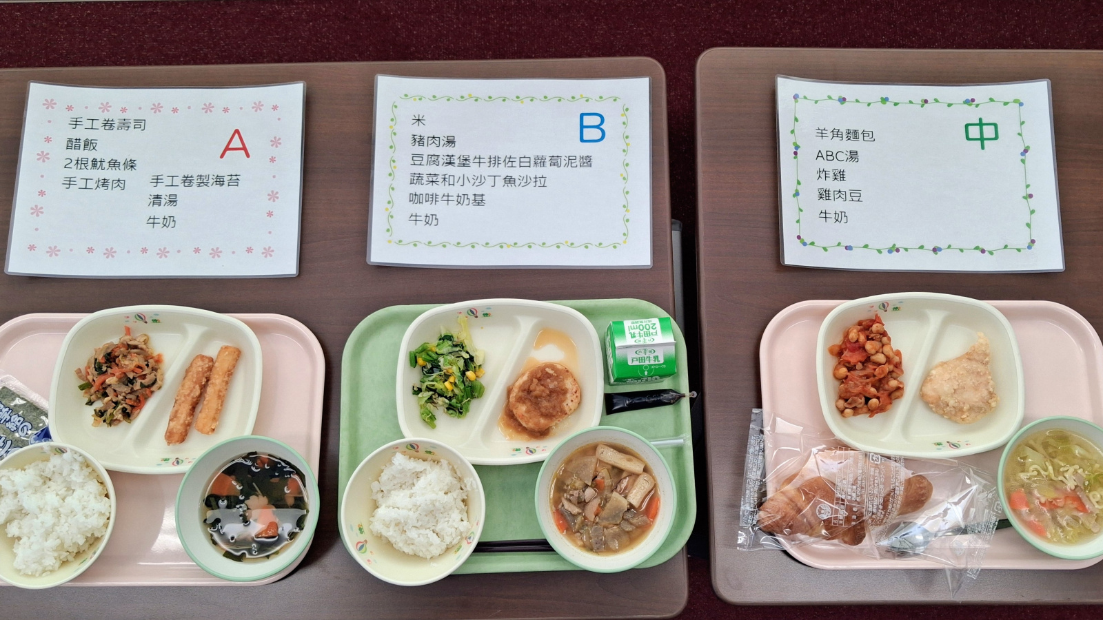 大家今天吃的是B套餐,餐點為白飯、小魚乾拌蔬菜、豆腐漢堡排、豚汁(豬肉味噌湯)、牛奶。而為了讓各位了解其他的餐點,我們也準備了A餐和國中生套餐,歡迎嚐嚐!