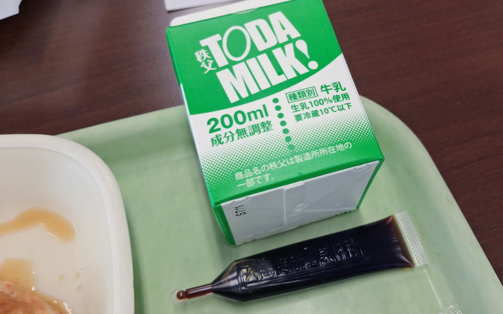 大家今天吃的是B套餐,餐點為白飯、小魚乾拌蔬菜、豆腐漢堡排、豚汁(豬肉味噌湯)、牛奶。而為了讓各位了解其他的餐點,我們也準備了A餐和國中生套餐,歡迎嚐嚐! 另外,要提醒大家,那一個黑色小管是咖啡口味糖漿,是用來擠入牛奶中,可以自由調配專屬咖啡牛奶。