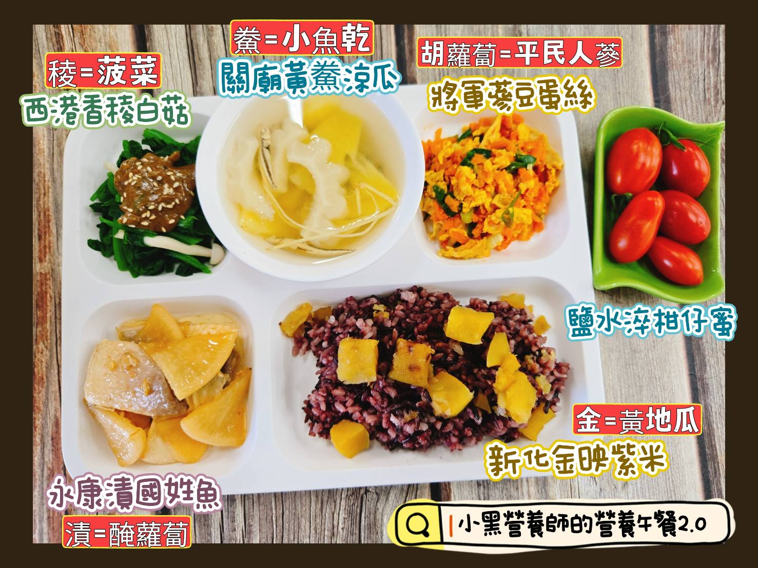 這次捲土重來,小黑營養師邀請兩屆臺南市學校午餐廚藝競賽金牌獎得主的資深校廚黃賴美金並肩作戰,端出呈現臺南風土的作品「新化金映紫米、永康漬國姓魚、將軍蔘蛋豆絲、西港香薐白菇、關廟黃鯗涼瓜、鹽水淬柑仔蜜」,從命名到食材都別具巧思。