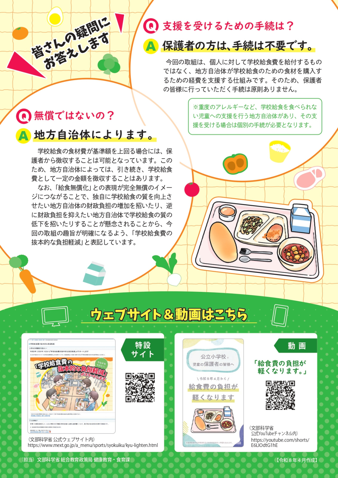 本措施以支援育兒為目的,由國家針對公立小學(包含義務教育學校前期課程及特殊教育學校小學部)學生學校午餐所需的食材費,提供地方自治體經費支援。