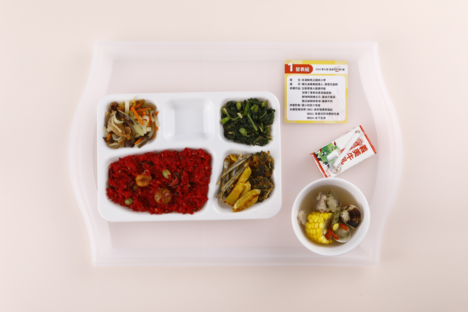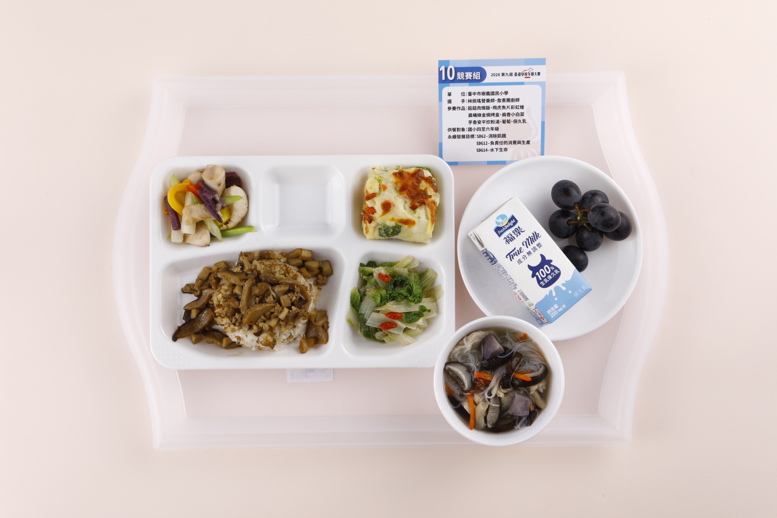作品|菇菇肉燥飯、飛虎魚片彩虹燴、晨曦綠金焗烤盒、麻香小白菜、芋香安平炊粉湯、葡萄、保久乳