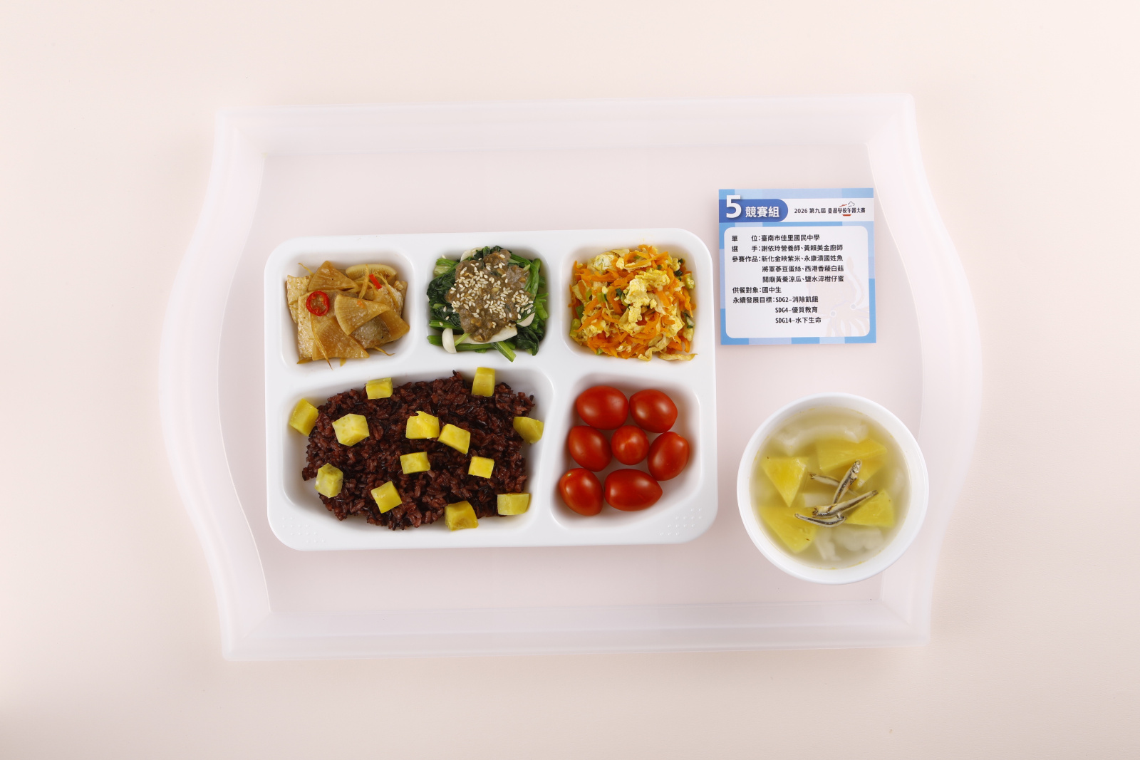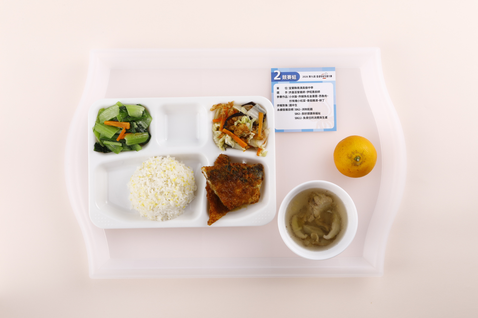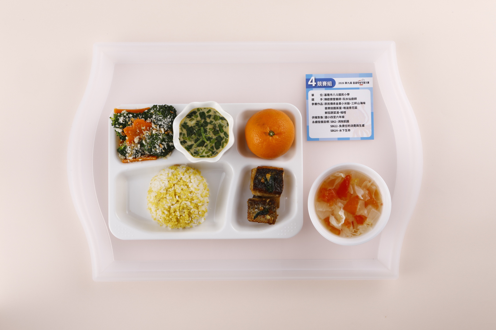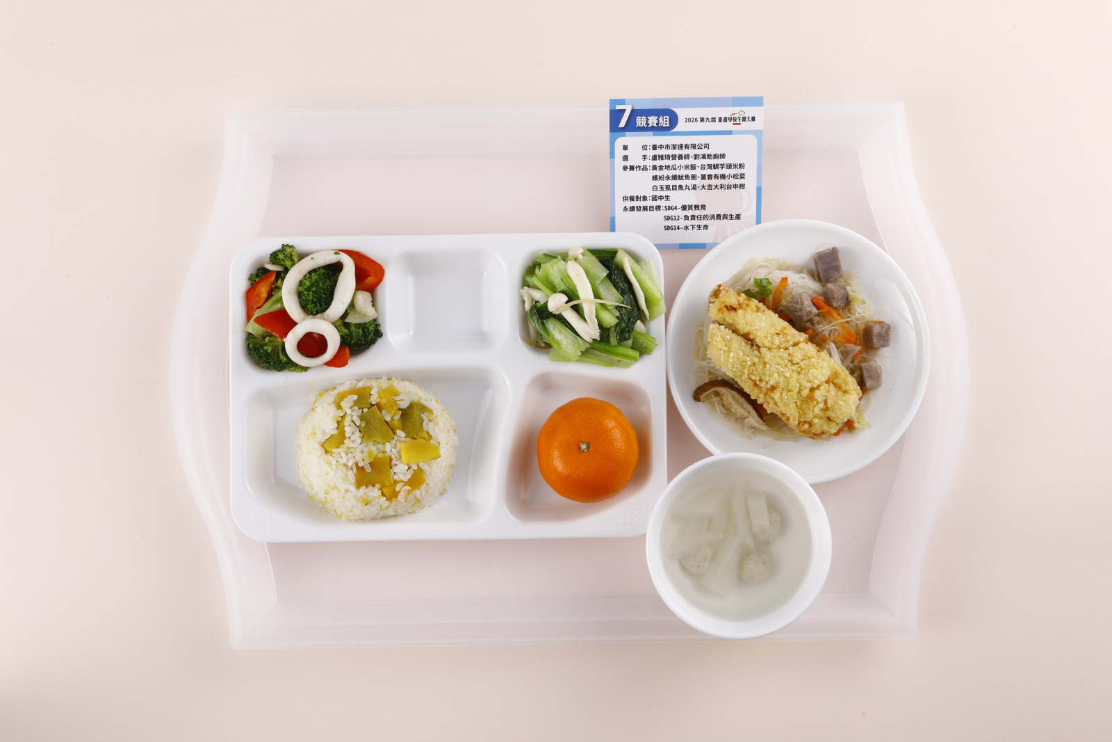 作品|黃金地瓜小米飯、臺灣鯛芋頭米粉、繽紛永續魷魚圈、白玉虱目魚丸湯、大吉大利台中柑