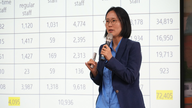 任職於韓國首爾市華園中學、亦曾於2024年參與第三屆臺日韓學校午餐交換活動的金正美營養教師,在學校服務已有七年期間。此次受邀來臺分享韓國學校營養午餐議題,她從1980年代韓國女性投身職場的情況切入,言簡意賅地介紹韓國校園供餐這四十多年來的發展。