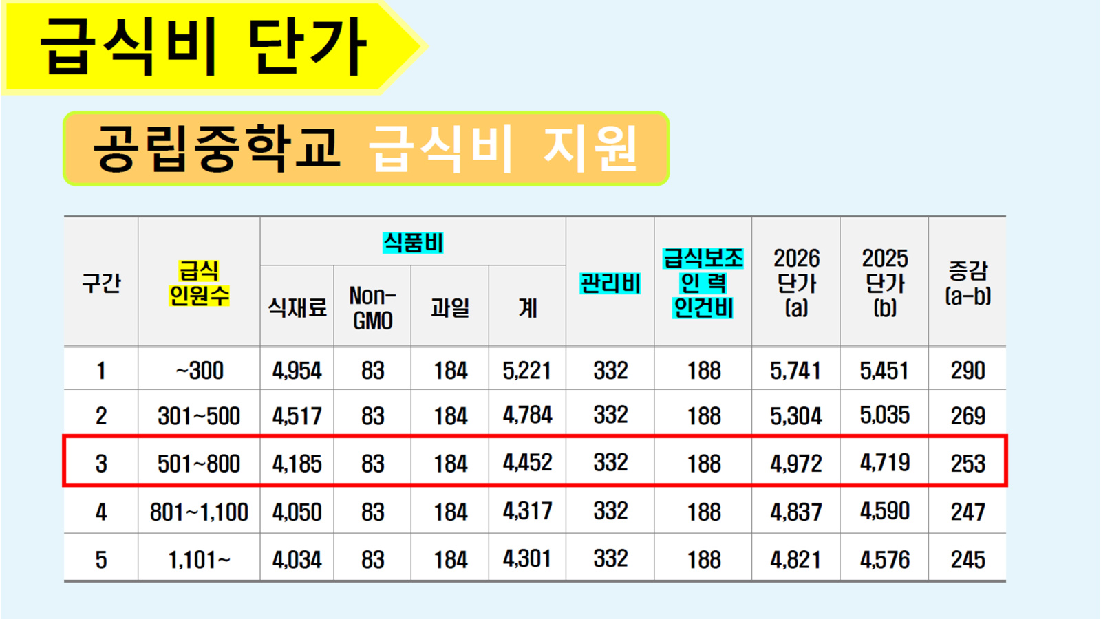 金老師以首爾市教育廳發布、供各校在推動學校午餐與供餐業務時作為依據的〈2026學年度學校供餐基本方針〉文件為例,中學標準經費共分為五個區間,從每餐4,821至5,741韓元(折合新台幣約為113元至135元);教職人員則為6,550韓元(折合新台幣約154元),由地方政府編列預算支應。