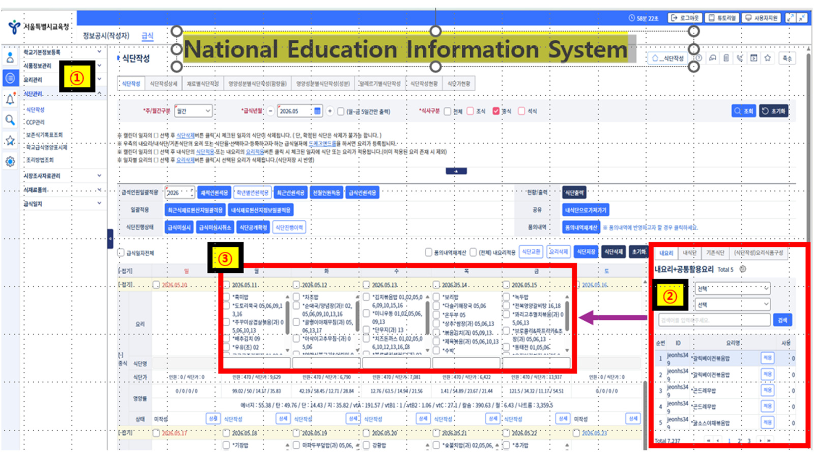 在菜單設計時,需要同時考量預算與營養價值。韓國有一個教育資訊系統,只要輸入食材用量與單價,系統會自動計算營養成分,協助我調整菜單。