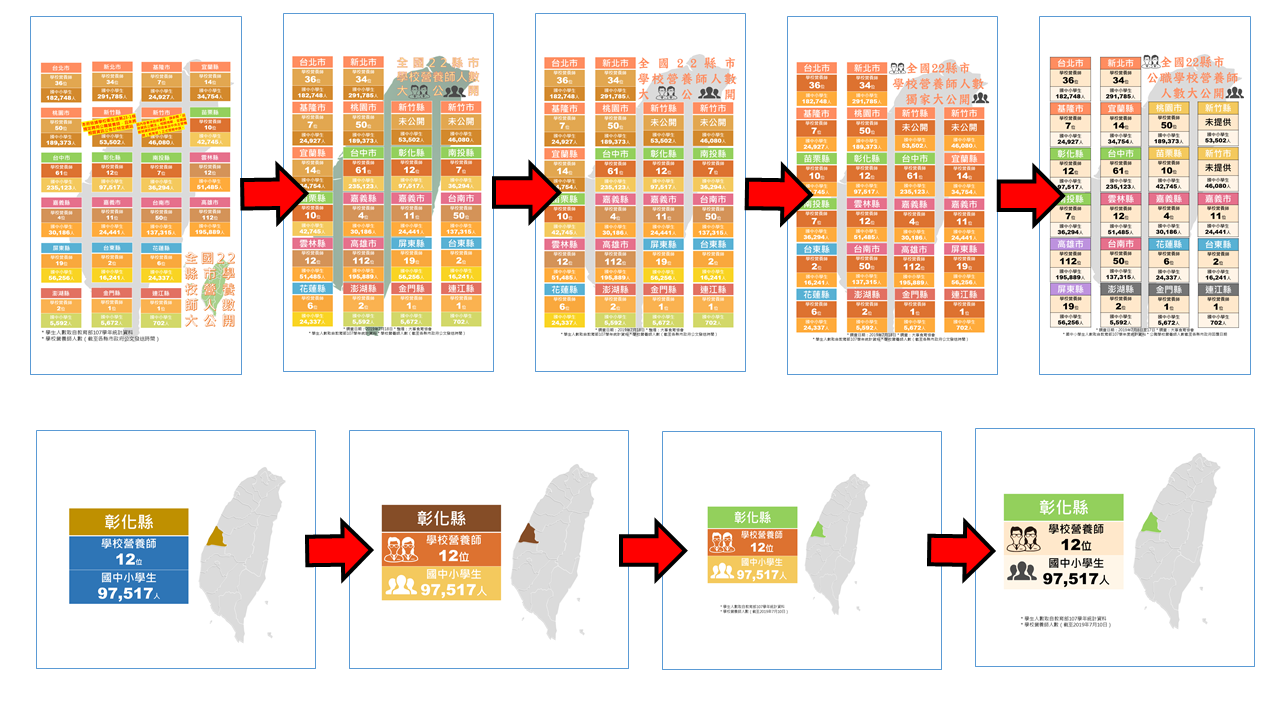 看似程序上十分容易操作,但在畫面呈現上的配色這一個步驟就足足讓我卡關了許久,除此之外要將22個臺灣縣市的學校營養師資訊放到一張圖內對我也是一個考驗,在沒有天賦異稟的藝術細胞加持下,除了土法煉鋼的尋找配色元件,也只能邊做邊詢問辦公室工作夥伴們顏色搭配或是排版是否清晰易懂,再慢慢進行修正。